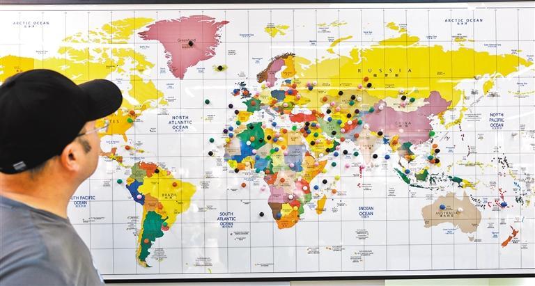 10月15日,义乌市国际商贸城一家商户的墙上挂着产品覆盖区域地图。义乌市场有210多万种商品,销往230多个国家和地区。