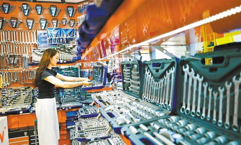 10月15日,义乌市国际商贸城二区市场,商户在整理货品。该市场主要经营五金工具、新能源、小家电等。