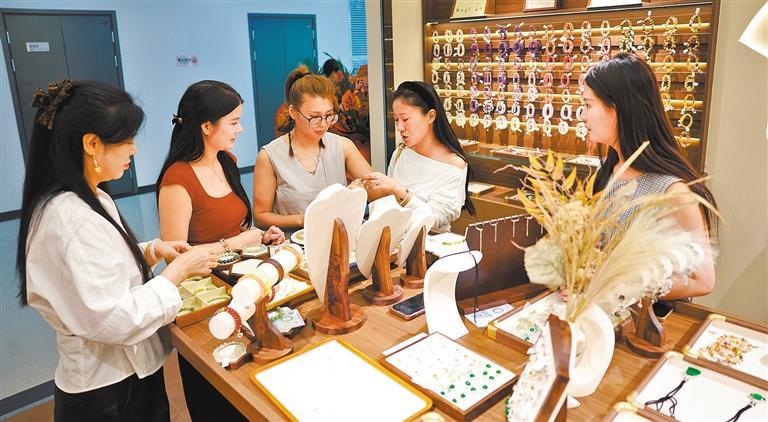 10月14日,客商在义乌全球数贸中心选购珠宝饰品。